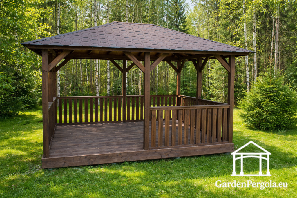 3x4 Mörkbrun Trädgårdspaviljong i Trä — Öppen, Hållbar och Perfekt för Utomhusliv