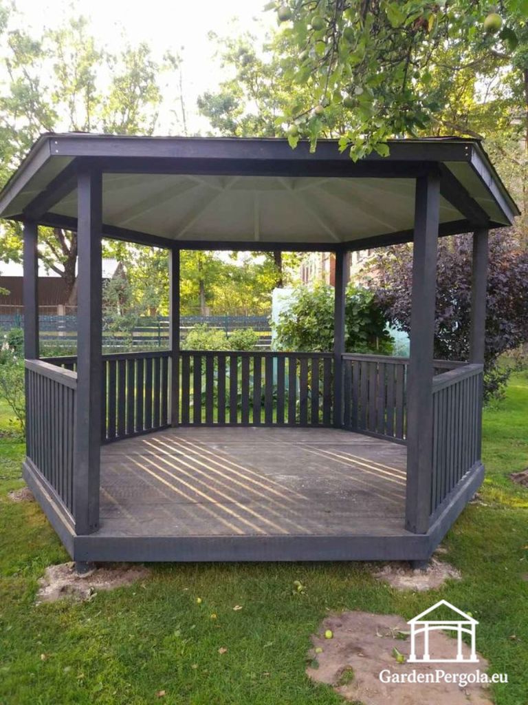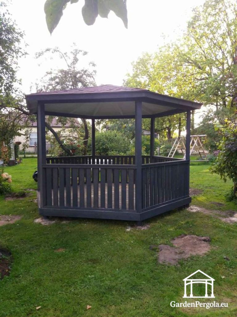 Denna sexkantiga mörkgrå träpaviljong är designad för att ge balans, hållbarhet och modern stil till din utomhusmiljö. Med en identisk hexagonal struktur mäter varje sida 2,1 meter, vilket skapar en perfekt symmetrisk design som ser imponerande ut från alla vinklar och integreras vackert i både naturliga och moderna trädgårdsmiljöer.