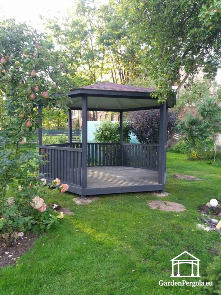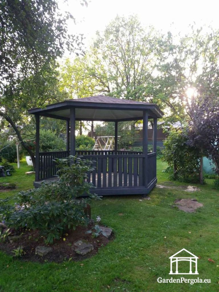 Sexkantig mörkgrå trädgårdspaviljong med rött shingeltak — Perfekt symmetri med en djärv look