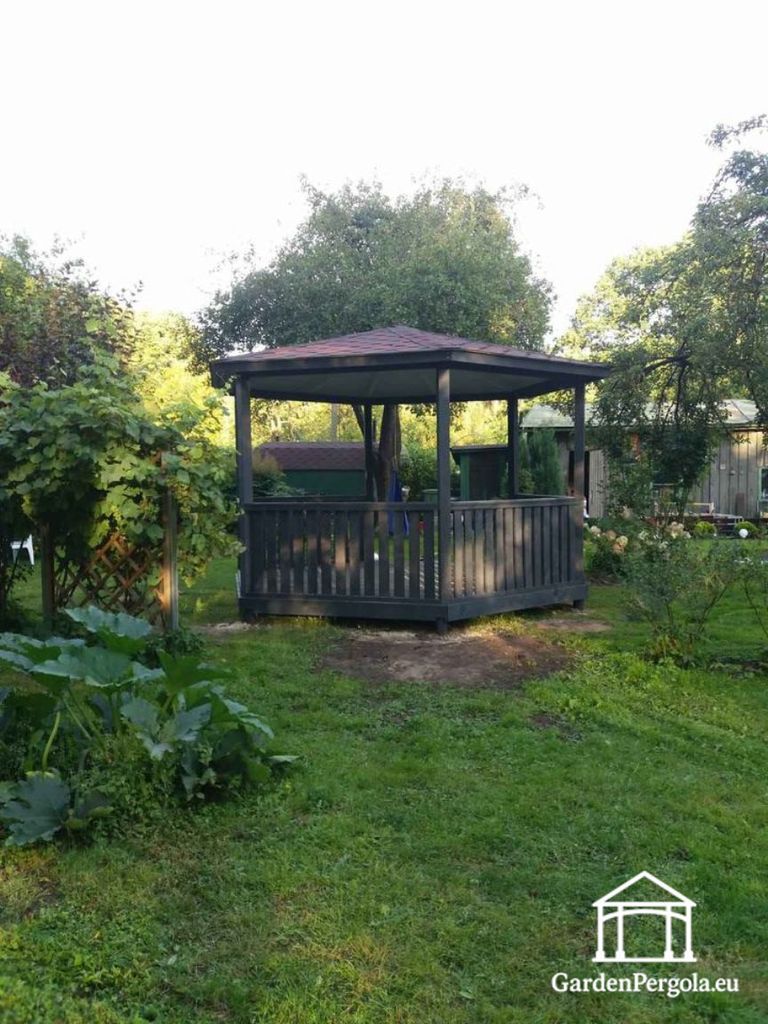 Färdig i en sofistikerad mörkgrå ton, ger denna paviljong ett premium, modernt utseende. Det kontrasterande röda shingeltaket tillför karaktär samtidigt som det erbjuder pålitligt skydd mot sol, regn och växlande väderförhållanden — vilket gör strukturen lämplig för året runt njutning.