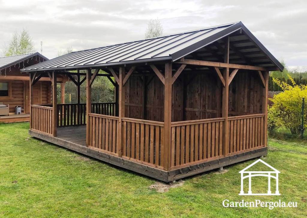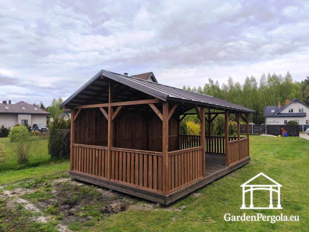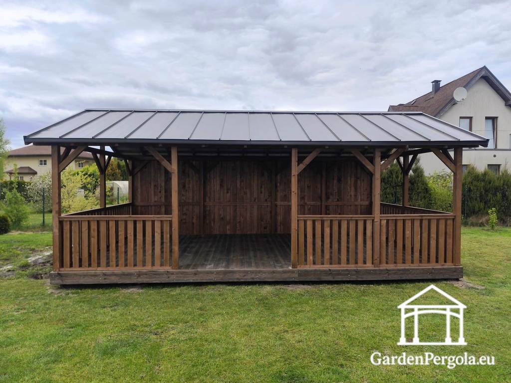 Robust 4x7m Brun Trädgårdspaviljong med Dubbelsidigt Metalltak
