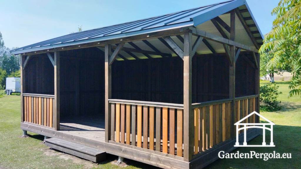 Paviljongen har ett hållbart tvålutande (sadeltak) tak i mörkgrå metall, som erbjuder enastående skydd mot regn, snö och växlande väderförhållanden. Denna taklösning förbättrar inte bara livslängden utan ger också strukturen ett rent, modernt utseende samtidigt som det kräver minimalt underhåll.