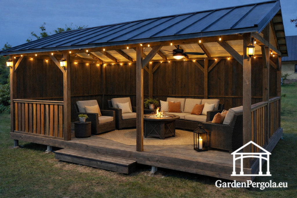 Brun Trädgårdspaviljong med Tvålutande Metalltak — Rymlig, Hållbar och Byggd för Skydd